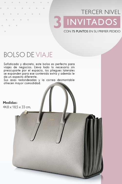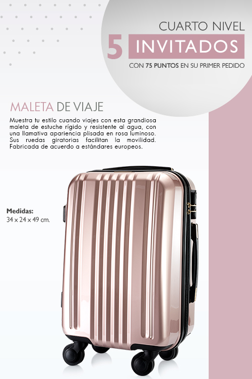 Todos los socios participan. / Programa vigente del 6 al 26 de julio de 2019. / Para ganarte dos maletas de viaje de la Colección Dusty Pink, TÚ debes ganar la Colección Dusty Pink completa en Catálogo 10, es decir tener 5 o más invitados con 75 puntos o más en su primer pedido entre el 6 de julio y el 26 de julio de 2019. / Debes realizar un pedido de 100 puntos o más hasta el 26 de julio de 2019. / El Premio se te entregará GRATIS en Catálogo 12 en tu pedido con puntos. / Las devoluciones de productos con puntos se restarán del puntaje acumulado y podrán ocasionar la pérdida del premio. / Para llevarte tu premio, no puedes tener deuda vencida.